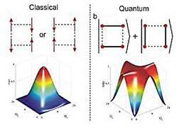 Respectively, the ‘OR’ of the classical world, our everyday world, (in the left picture) tell us there are only one of two possible outcomes for the alignment of the magnets, and the quantum state equation, the hidden quantum world, (right picture) encapsulate the entangled state of the magnets, having no knowledge of their individual states, so that the measurement of one state instantaneously influence the second state ,( in the general case ‘a’ and ‘b’ are probabilities amplitudes allowing one of many possible independent outcomes). And further, why is it so important to be able to find entangled states in ordinary matter? because the entanglement of the magnets ( their spins in superposition ) are today considered as a natural physical resource just like crude oil and coal, and can be the ‘fuel’ to use and build quantum computer.. And so on, and so on.