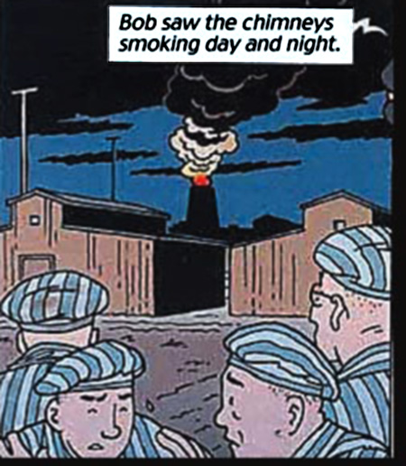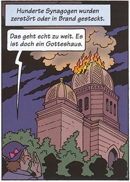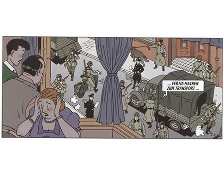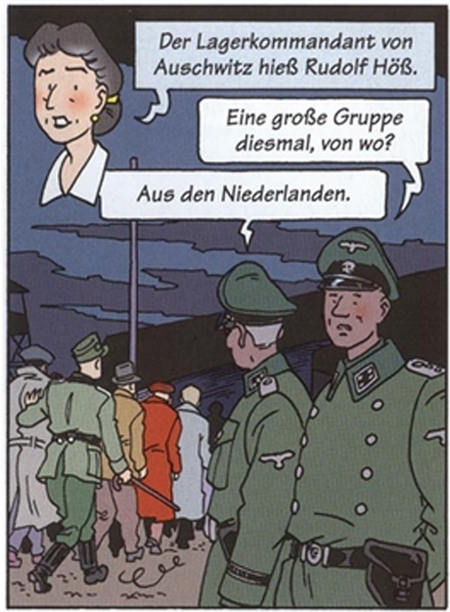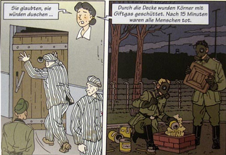 I am aware that the German edition of this comics book is intended for pupils of the German schools . But there are people, much older, in their fifties and sixties, who remember the veritable atrocity of the Nazi Era- atrocity embellished here for an educational purpose by the Tintin-style style and so perhaps leading by inadvertence kids or parts of the today general public to made the colossal unforgivable mistake that the Holocaust is a super comics adventure…see here and here.