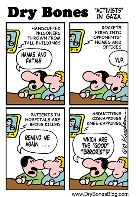 One of the best Israeli cartoonist is Dry Bones Cartoonist Yaakov Kirschen. Looking at his cartoons I undestand Tarek (Al Khan) Shahin’s common traits with Yaakov (Bones) Kirschen: the Egyptian and the Israeli cartoonists cooperate in the invisible space of laughter, far away from the earthly vissitudes of censorship… but only for the people who wants to laugh.