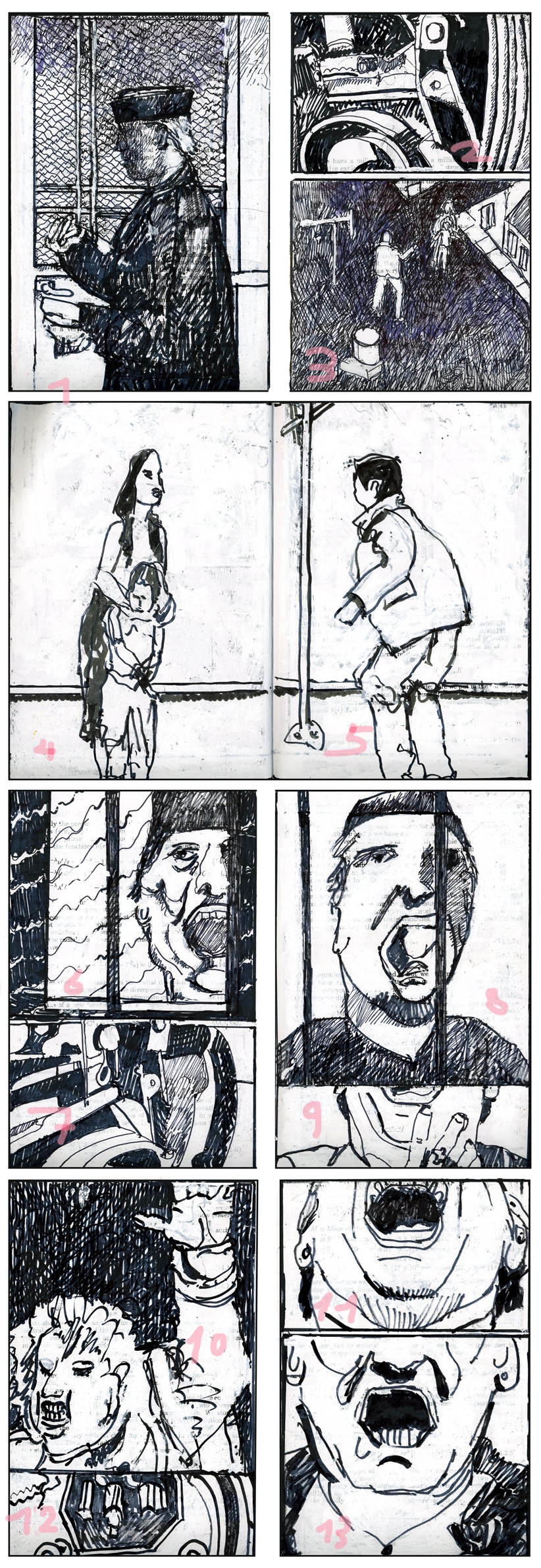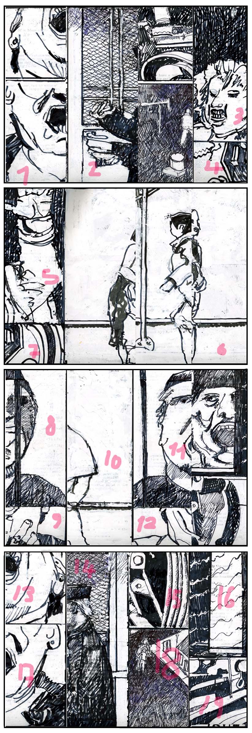 In the making of the above drawing I had the unpredictable vision that it was not a conventional comics layout I am drawing into. In my perverse view, the bounding boxes are not boxes at all. For me they delimit rooms, a succession of rooms in a Jorge Louis Borges finite Labyrinth.