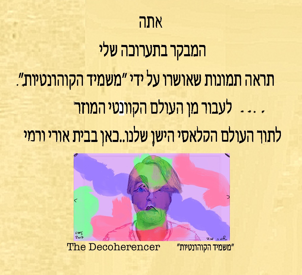 October 24, 2017October 24, 2017Quantum,Environment,Classical //\\ Liberté, égalité, fraternité So You , visiting my exhibition, are looking at pictures confirmed (by the Decoherencer) to pass from the weird quantum world into our own old classical world here at the museum “Beit Uri and Rami” Confirmed Share this: Click to share on Facebook (Opens in new window) Facebook Click to print (Opens in new window) Print Click to email a link to a friend (Opens in new window) Email Like Loading... Related
