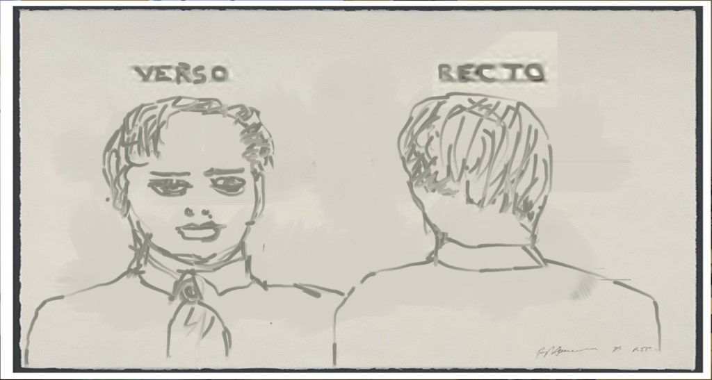 in front of me is what i actually see (Verso)…SO MOST OF the TIME I PRESUPPOSE THAT MY AFTER-BACK EXIST (Recto) …and THAT IS “REALLY” ASSURING……So people that detect my pictures (Verso) my also momentarily suppose that behind them (Recto) there is something….But in quantum(POP)physic that’s an open question ?!.. Because it may be that there is nothing there… Now, I am convinced that they, the true art lovers, don’t like my metaphysical garbage…Well, I don’ blame them ….(VERSO,RECTO)….does a mirror on my back see something…
