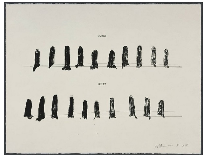 In a lesser fancy way Verso Recto (state II) by Nauman incorporates elements of his body into his art making process, the phantasmal shapes of fingers lined in two rows, “verso” and “recto.” The messy, smudged style and the blatant fragmentation in this print are darkly humorous and slightly sinister.