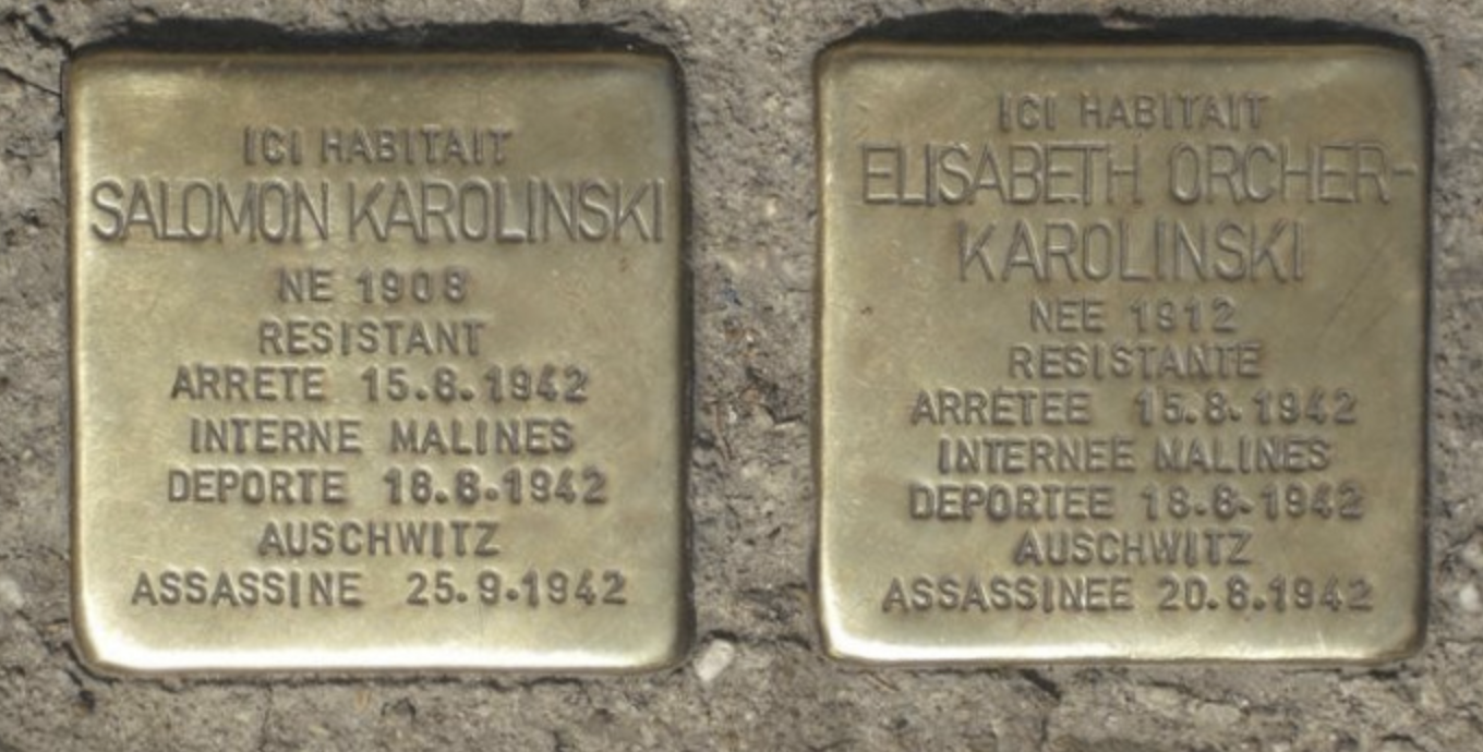 The Polish-Jewish Karolinski couple, Salomon and Elisabeth, were living as refugees in Belgium at the time of the Nazi invasion. The couple became involved with the Belgian Resistance; their good work, however, was cut short when they were arrested and deported on Convoy 4 out of the Mechelen transit camp, to Auschwitz. Elisabeth was gassed to death on arrival; Salomon, selected for work, was murdered a month later.
